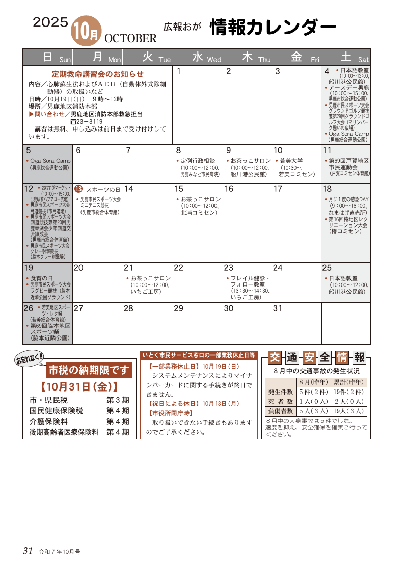 イベント 広報おが(2025年10月号) P.31 31/32 前の記事 次の記事 発行日 : 2025年10月01日 自治体名 : 秋田県男鹿市 広報紙名 : 広報おが (2025年10月号) Tweet シェアする 広報おが(2025年10月号) P.30 広報おが(2025年10月号) P.32