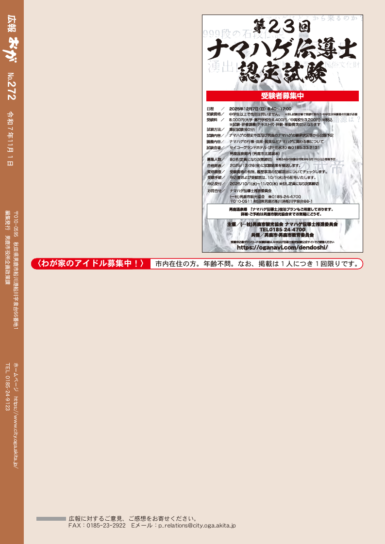 その他 広報おが(2025年11月号) P.26 26/26 前の記事 発行日 : 2025年11月01日 自治体名 : 秋田県男鹿市 広報紙名 : 広報おが (2025年11月号) Tweet シェアする 広報おが(2025年11月号) P.25