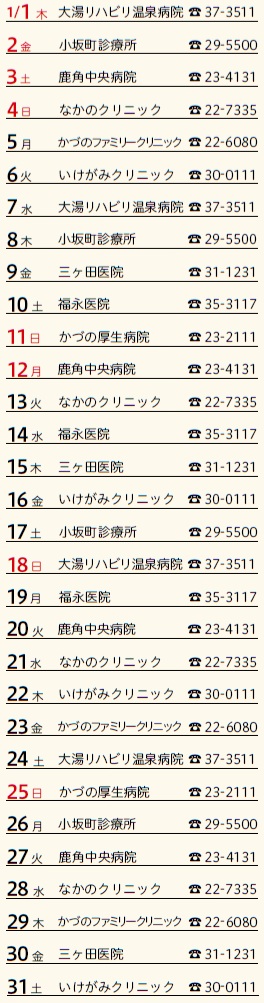 くらし 在宅当番医 28/29 前の記事 次の記事 発行日 : 2026年01月01日 自治体名 : 秋田県鹿角市 広報紙名 : 広報かづの 令和8年1月号 診察時間: ・月曜~金曜…17時~20時 ・土曜…14時~17時 ・日曜祝日、年始(赤字)…8時30分~17時 ※かづの厚生病院の入り口は、「救急入口」です。 Tweet シェアする 今月の新刊 その他のお知らせ(広報かづの 令和8年1月号)