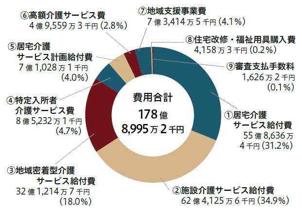 ※グラフの金額は大仙市、仙北市、美郷町の総額です。約50%を介護保険料(65歳以上の方が約23%、40〜64歳の方が約27%)で、残りは税金で賄っています。