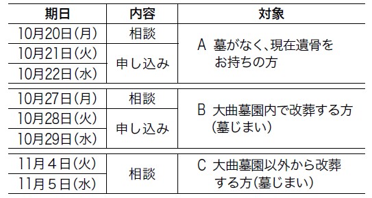 ■大曲墓園(大曲西根仁応治地内)に合葬墓(一つの墓に遺骨を合同で納骨するもの)が10月中に完成し、11月に利用を開始します。合葬墓の利用に関する事前相談と利用申し込みの受け付けを左表のとおり行います。相談、利用申し込みともに予約が必要です。