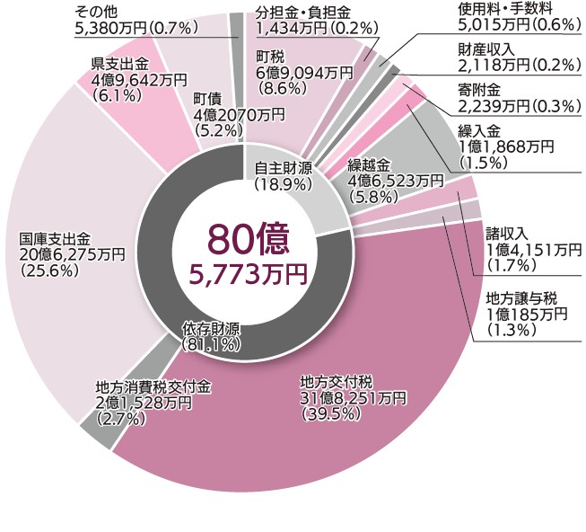 皆さんから納めていただいた町民税や固定資産税などの自主財源は、15億2、442万円で歳入の18・9パーセントです。また、地方交付税や補助金などの依存財源は、65億3、331万円で、歳入の81・1パーセントを占めています。
