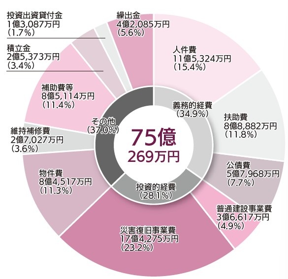 予算の主な使いみちについては、令和5年度大雨の被災住宅応急修理等や繰越事業含む災害復旧事業(農地・農業用施設、林道施設、公共土木施設)などに17億5、386万円、ウッドロード歩道等LED化事業に2、258万円、町道の整備事業に7、686万円、橋梁補修工事1億4、058万円、除雪事業に1億5、596万円などとなっています。