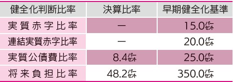 財政の健全化を示す指標の実質公債費比率は8・4パーセント、将来負担比率は48・2パーセントで、それぞれ基準とされている25・0パーセント、350・0パーセントを下回っており、当町の財政は「健全」と判断されています。