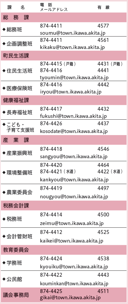 その他 井川町役場 各課の電話番号・メールアドレス 2/29 前の記事 次の記事 発行日 : 2025年12月01日 自治体名 : 秋田県井川町 広報紙名 : 広報いかわ 2025年12月号 Tweet シェアする 今月の表紙 施設等の利用状況(10月)