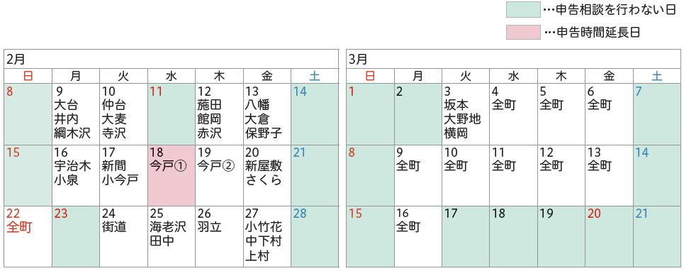 日曜開催日は大変混み合います。申告時間延長日やe-Taxでの申告もご検討ください。