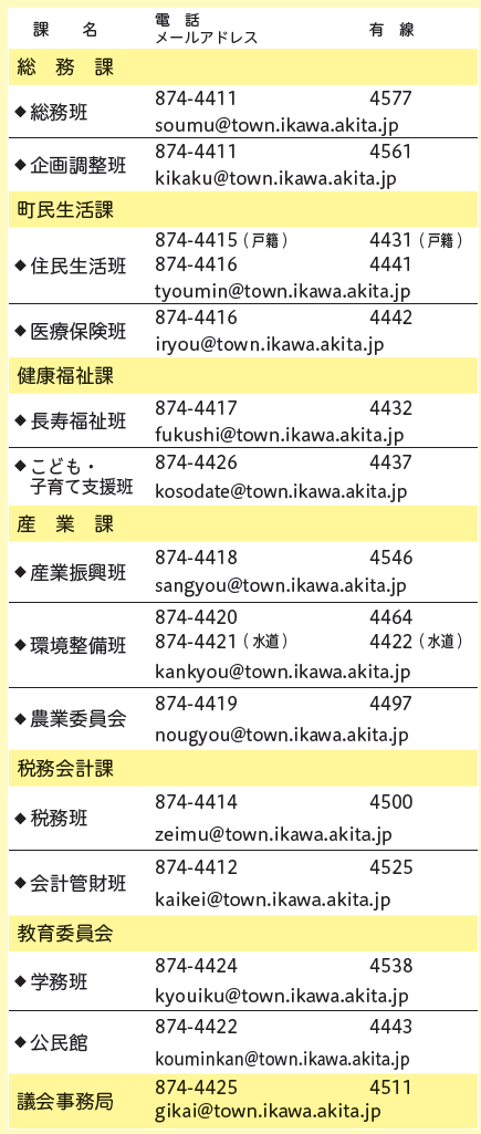 その他 井川町役場 各課の電話番号・メールアドレス 2/32 前の記事 次の記事 発行日 : 2025年10月01日 自治体名 : 秋田県井川町 広報紙名 : 広報いかわ 2025年10月号 Tweet シェアする 今月の表紙 施設等の利用状況(8月)