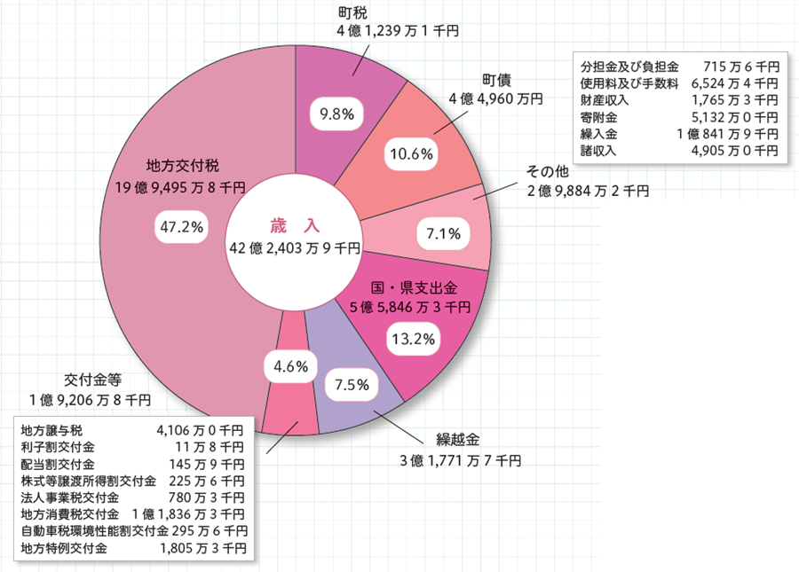 収入済額は42億2,403万9千円で、前年度の40億425万5千円と比べ、2億1,978万4千円の増となりました。歳入の内訳は、地方交付税が全体の47.2%を占める19億9,495万8千円で、前年より5,765万2千円の増となりました。また町税収入は、全体の9.8%となる4億1,239万1千円となり、前年度より2,452万6千円の減となりました。