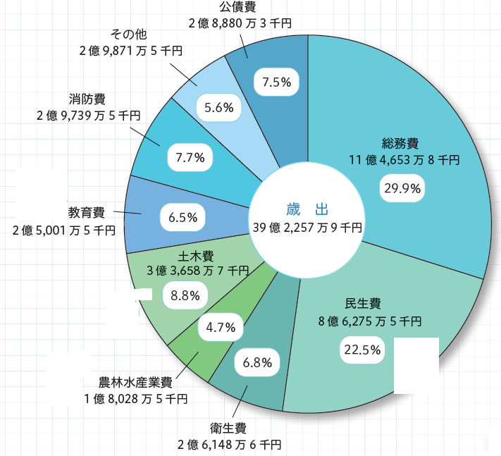 支出済額は39億2,257万9千円で、前年度の36億8,653万8千円と比べ、2億3,604万1千円の増となりました。令和6年度は普通建設事業に5億8,328万3千円を投入し、インフラの整備などを行いました。