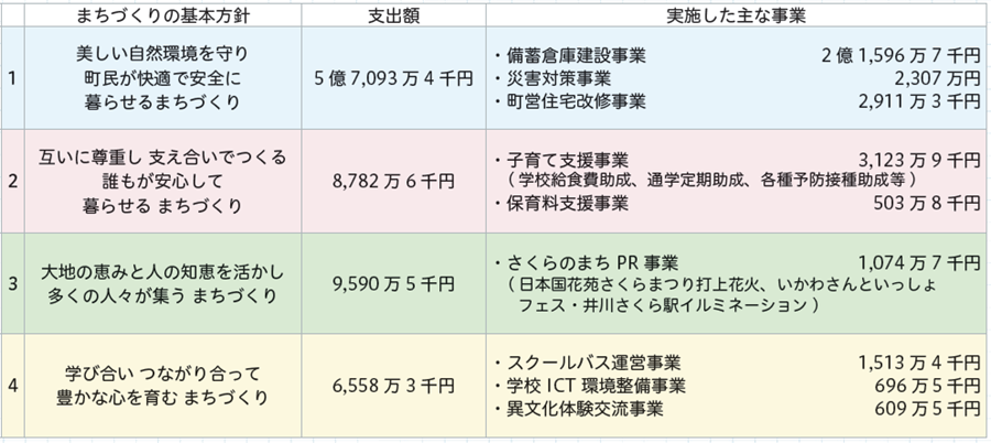 町では、令和3~12年度までの10年間の展望と長期的な町政運営方針を定めたまちづくりの指針であり、「豊かに咲き誇る笑顔で心が弾むまち」を基本理念とした第五次井川町総合振興計画を策定しています。本計画には4つの基本方針があり、その方針に沿いながら、町では様々な事業を実施しております。