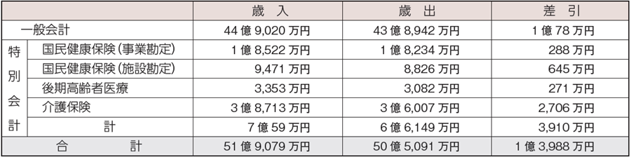令和6年度一般会計の決算額は、歳入総額44億9020万円、歳出総額43億8942万円となり、歳入歳出差引額は1億78万円で、翌年度に繰り越される財源を控除した実質収支は8214万円の黒字決算となりました。