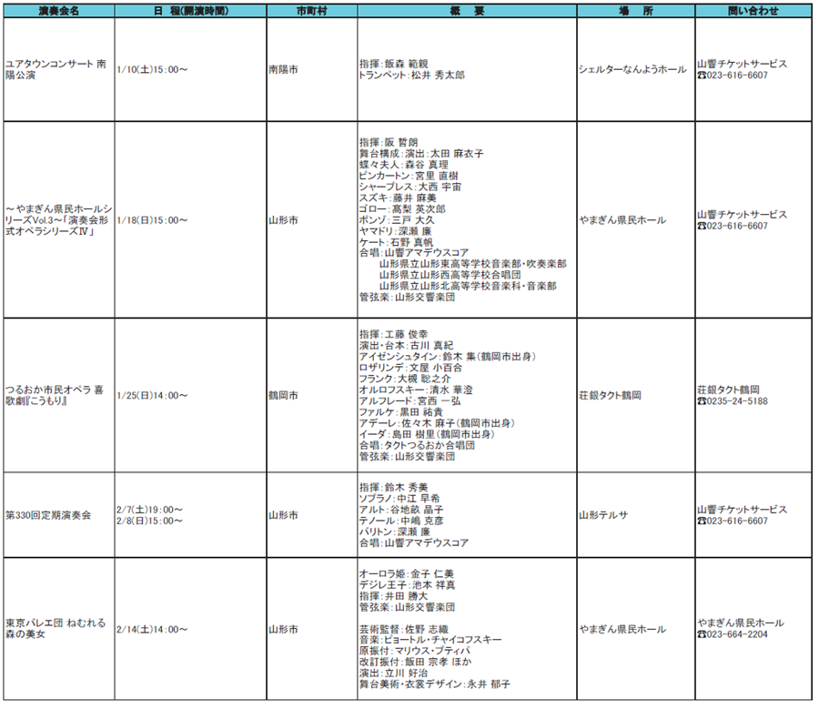 イベント 山形交響楽団演奏会(県内版) 27/30 前の記事 次の記事 発行日 : 2026年01月01日 自治体名 : 山形県 広報紙名 : 山形県 観光イベントカレンダー (2026年1月・2026年2月) Tweet シェアする プロスポーツ試合情報(県内版) スキー場オープン情報等(1)