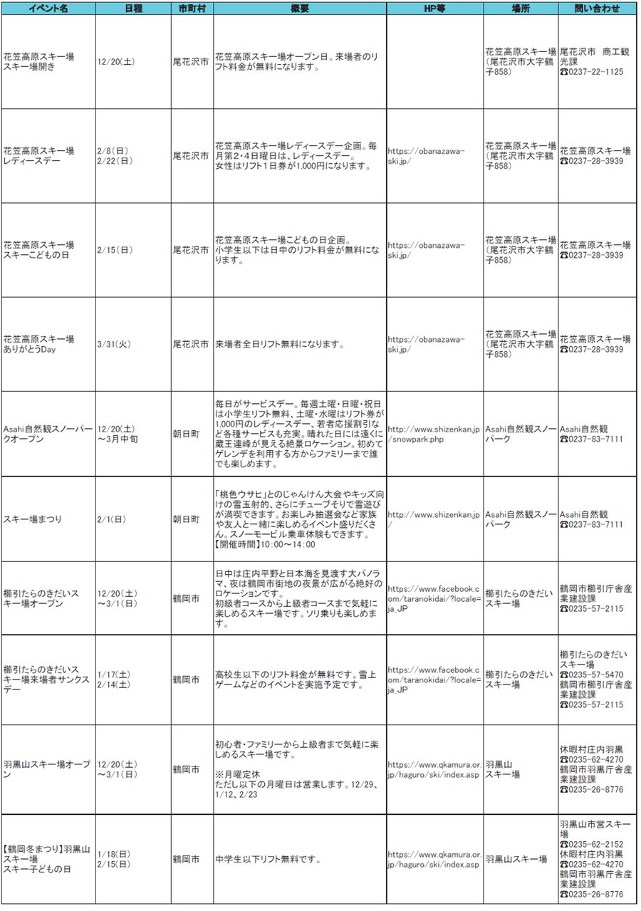 スポーツ スキー場オープン情報等(2) 33/34 前の記事 次の記事 発行日 : 2026年02月01日 自治体名 : 山形県 広報紙名 : 山形県 観光イベントカレンダー (2026年2月・2026年3月) ※降雪状況により変更となる場合があります。 Tweet シェアする スキー場オープン情報等(1) スキー場オープン情報等(3)