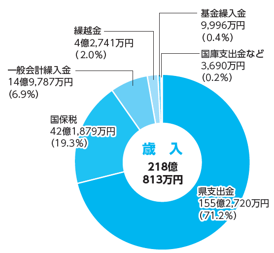 歳入は、国保税が全体の約19.3%の42億1,879万円となっており、その他に、県からの交付金などを財源に事業を運営しています。(表1)