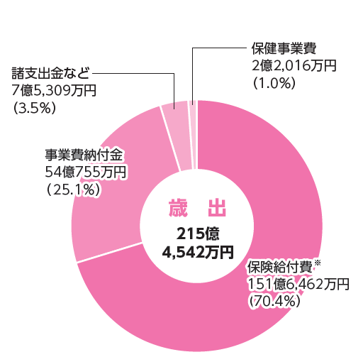 歳出は、病気で医療機関を受診したときの費用などである保険給付費が151億6,462万円で全体の約70.4%となっており、前年度と比較して2.6%減少しています。また、平成30年度から国保の保険者となった県に対して、事業費納付金を負担しています。(表2)