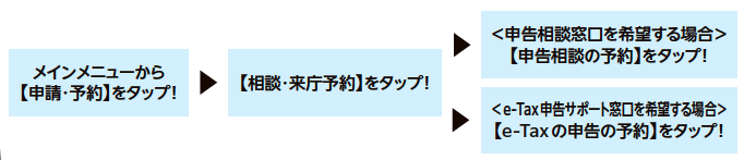 申告会場の混雑緩和と利便性向上のため、申告相談窓口の一部を「LINE予約専用窓口」とします。事前に予約をしておくことで、待ち時間なく申告相談できます。また、2月10日(火)・12日(木)・13日(金)の期間限定で「e-Tax申告サポート窓口」も設置します。
