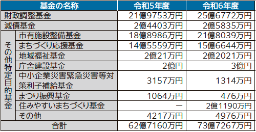 令和6年度は、財政調整基金やまちづくり応援基金など、総額7億円を取り崩しましたが、ふるさと納税寄附金の増加による積立額の増加や土地開発公社の解散による「住みやすいまちづくり基金」の創設などにより、積立基金の総額は、対前年度11億107万円の増加となりました。