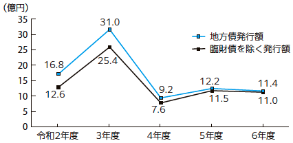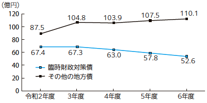 なお、この地方債の中には、その全額が国から交付される「臨時財政対策債」も含まれ、それを除いた地方債の残高は110億830万2千円で、対前年度2億6112万円の増となっています。