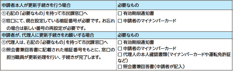 スマートフォンやパソコン、郵送などにより更新手続きが可能です。新しいカードの発行まで申請から約1カ月かかります。カードが出来上がり次第、市より案内のハガキが届きますので、ハガキに書かれた必要書類を持って、市民課窓口にお越しください。※詳しくは、右記二次元コード(本紙参照)より市ホームページをご覧ください。