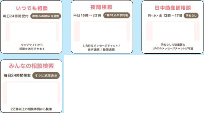 妊娠中から子育て期まで、日常の不安や育児の悩みを産婦人科医や助産師、小児科医が24時間体制でオンライン相談に対応する「産婦人科医・小児科医オンライン」を導入し、日中は忙しくてなかなか相談に行けない方でも、オンラインで気軽に医師・助産師へ相談できます。