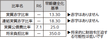 自治体の財政状況を分析するためのさまざまな指標を総称して「財政指標」と呼びます。本市の一般会計において、財政健全化判断比率は国が定める基準を概ね下回り、健全な数値となっています。