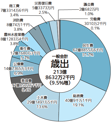 歳出決算額:213億8632万2千円(対前年度比約18億6422万円の増)