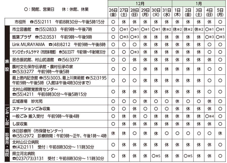 ■北村山公立病院は、12月27日(土)、28日(日)のみ、午前8時30分~午後5時に小児医師が待機しています。また、人工透析は日曜日以外行います。