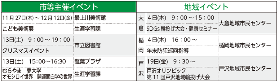 イベント EVENT INFORMATION 12月 まちと地域のイベント情報 3/19 前の記事 次の記事 発行日 : 2025年11月15日 自治体名 : 山形県村山市 広報紙名 : 村山市報「市民の友」 2025年11月15日号 No.1427 ※イベントの詳細については、問合せ先に確認してください。都合により中止となる場合があります。 Tweet シェアする 「高血糖予防教室」参加者募集 カルチャートピック MURAYAMA