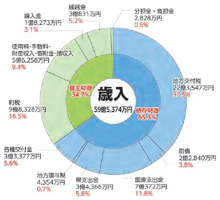 依存財源:国や県により定められた額が交付されたり、割り当てられたりする財源。