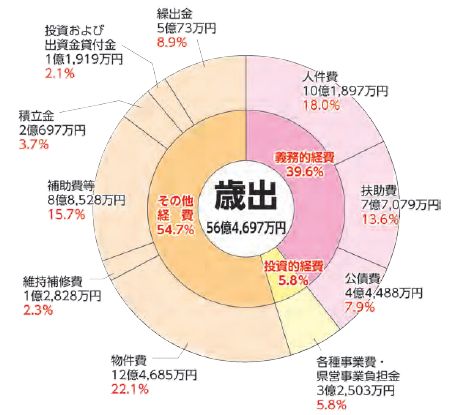 町立なかやま保育園の空調改修工事及び照明器具LED化改修工事等の実施などにより、令和5年度と比べ投資的経費が55.5%増加したことなどから、歳出全体としては、5億232万1千円(9.8%)の増となりました。