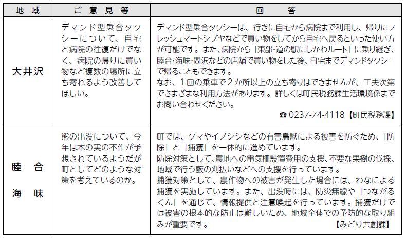 要望・ご意見9月22日・24日、町内13地区から地域の課題や町への要望などの意見をいただく「地域づくりヒアリング」を開催しました。各地区からいただいた要望は以下の通りです。