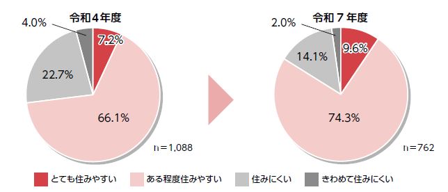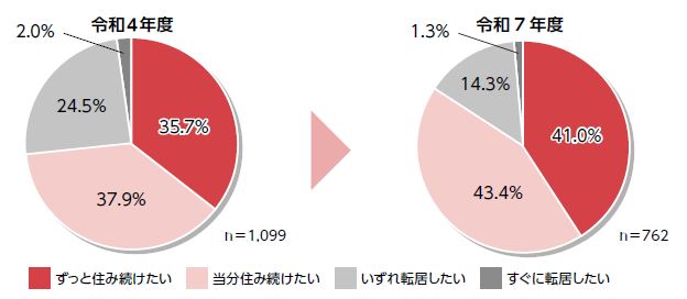 「とても住みやすい」、「ある程度住みやすい」と回答した方の割合は、前回調査と比較して、10.6%増加。「ずっと住み続けたい」、「当分住み続けたい」と回答した方の割合は、前回調査と比較して、10.8%増加しました。
