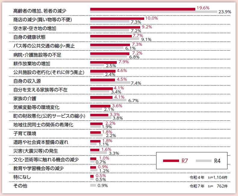 「5~10年先の将来を考えたときに、あなたが不安に感じることは何ですか」(複数回答可)を聞いたところ、最も多かったのが「高齢者の増加、若者の減少」(19.6%)、次いで「商店の減少」(10.0%)、「空き家・空き地の増加」(9.2%)でした。