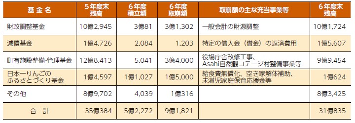 取崩額の総額は8.8億円。役場庁舎改修、Asahi自然観コテージ村再整備事業のほか、老朽化が進む施設の修繕・改修に町有施設整備・管理基金を取り崩したほか、星空の街・あおぞらの街全国大会事業には財政調整基金などを、学校給食費無償化事業および空気神社のライトアップの補助金などには日本一りんごのふるさとづくり基金を活用しました。