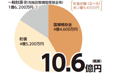 国庫補助金と町債(10頁下段に用語の説明)については、義務教育学校建設は事業費の約88%、コテージ村再整備は事業費の約85%に活用し、残りは町負担の一般財源(基金)で賄います。また、町債については返済額の約70%※が地方交付税として算入されるため、実際の町の負担は軽減されます。