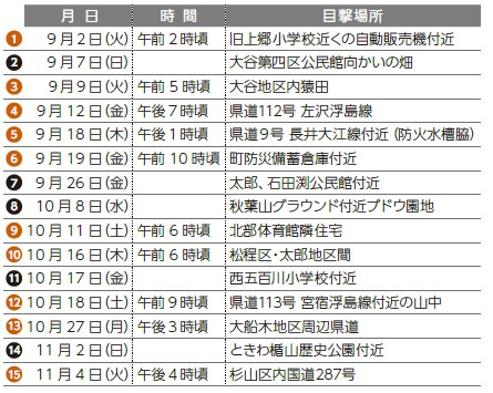 9月から11月5日までの間に町へ連絡があった、住宅周辺のクマの目撃情報です。