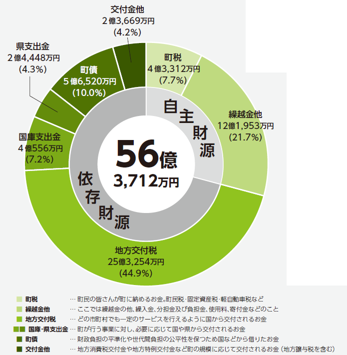 収入の約45%を占める地方交付税のうち普通交付税は、22億686万円(前年度比7,072万円増)と過去最大の交付額となりました。また、特別交付税は7月豪雨災害分が措置され、前年度比1,703万円増の3億2,568万円が交付されました。