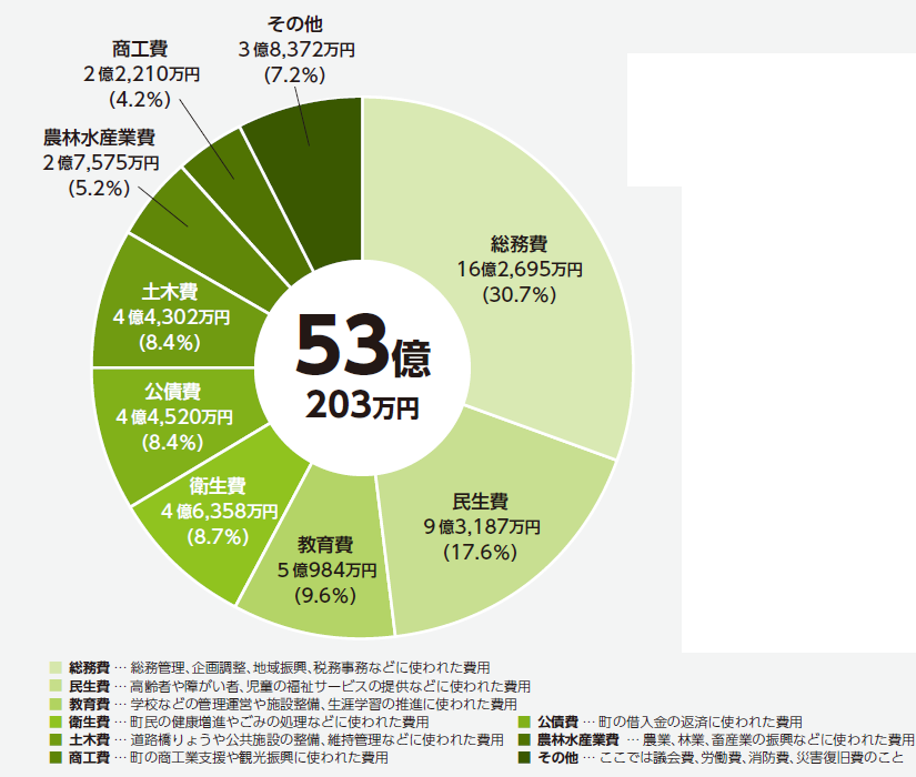 歳出は、昨年度比6億227万円の大幅増加。非常用電源装置設置事業や役場第2庁舎整備事業等により総務費が3億7千万円超の増加となりました。また、町制施行100周年記念事業が3,033万円の増加、7月豪雨災害に係る復旧事業費として、7,713万円が増加するなど、臨時的な増加要因も多くみられました。