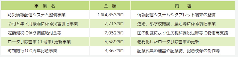 防災情報配信システム整備事業では、希望する全世帯にタブレット端末を貸与。1億4,853万円が皆増となりました。町制施行100周年記念事業は、記念式典企画運営委託料や記念誌制作委託料により3,033万円の増加。さらに物価高騰対策として、町民応援商品券配布事業4,777万円を実施しました。