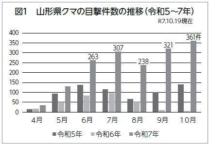山形県では、「クマ出没警報」(令和7年7月3日~9月30日)を発令し、クマによる人身被害の防止に向け、注意喚起を行っていたところですが、今年は9月以降も過去に例を見ないペースの目撃件数となっており、クマと遭遇する危険性の高い状態が続いています。(図1)