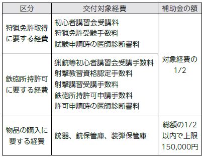 ▽狩猟免許の取得や銃の購入に対して補助が受けられます