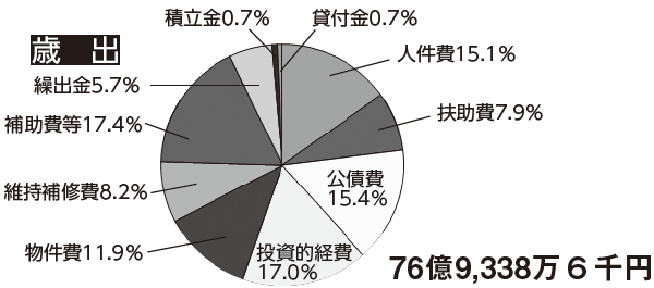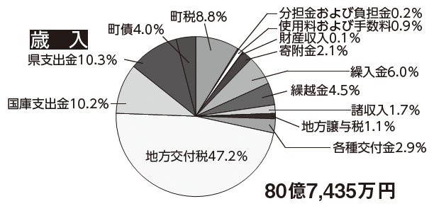 一般会計の歳入は、前年度比2.6%減の80億7,435万円、歳出は前年度比0.2%増の76億9,338万6千円となりました。