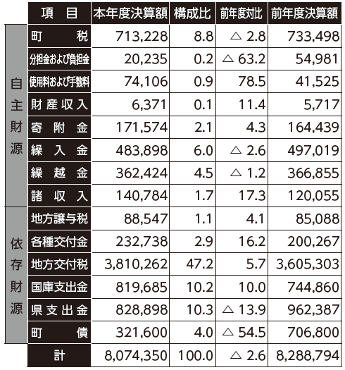 依存財源のうち歳入の4割以上を占める地方交付税は2億495万9千円増加し、前年度比5.7%の増、国庫支出金は公共土木施設災害復旧費負担金の増加などにより前年度比10.0%の増、町債は町民総合センター大規模改修事業が終了したことなどから前年度比54.5%の減となりました。