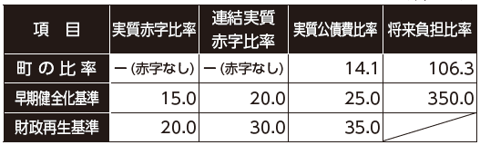 「地方公共団体の財政の健全化に関する法律」に基づき、健全化判断比率および資金不足比率の公表が義務付けられています。令和6年度決算に基づき算定した本町の比率は、下の表のとおりです。いずれの指標においても、基準を下回っています。今後とも、健全かつ持続可能な財政運営に努めます。