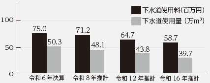 人口減少により低減する下水道使用量を予測し、将来の使用料を試算する。