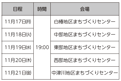 前回は、地域電力小売事業者と連携し、住民の皆さんに向けた「お得な電力料金プラン」を含めた説明会の開催を予告しました。11月17日(月)から各地区まちづくりセンターを会場に開催しますので、都合のよい会場を選んで、ご参加ください。