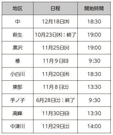 「中・萩生・黒沢・椿・小白川・東部・手ノ子・高峰・中津川」の9地区では、地域のこれからを話し合う地域づくり座談会を開催しています。地域の身近な困りごとや、地域のこれからを見据えた建設的な意見交換など、地域の課題と未来に向けて地域住民自身と行政が意見を交換する機会となっています。特に、11月は地域づくり座談会が開催される時期でもあります。