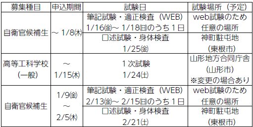 問合せ・申込み:防衛省自衛隊山形地方協力本部鶴岡出張所