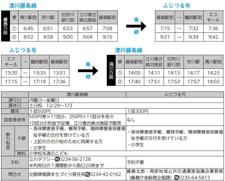 この路線は、路線バスの経路を引継ぐ形で藤島駅まで運行しています。藤島駅からは鶴岡市の新しい公共交通「ふじつる号」に乗継ぎし、鶴岡市内まで行くことができます。