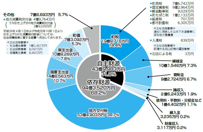 歳入は、総額で前年度に比べ3億869万円増額の138億3︐503万円となりました。町債や繰入金などは減額した一方で、寄附金や地方交付税などが増額となりました。